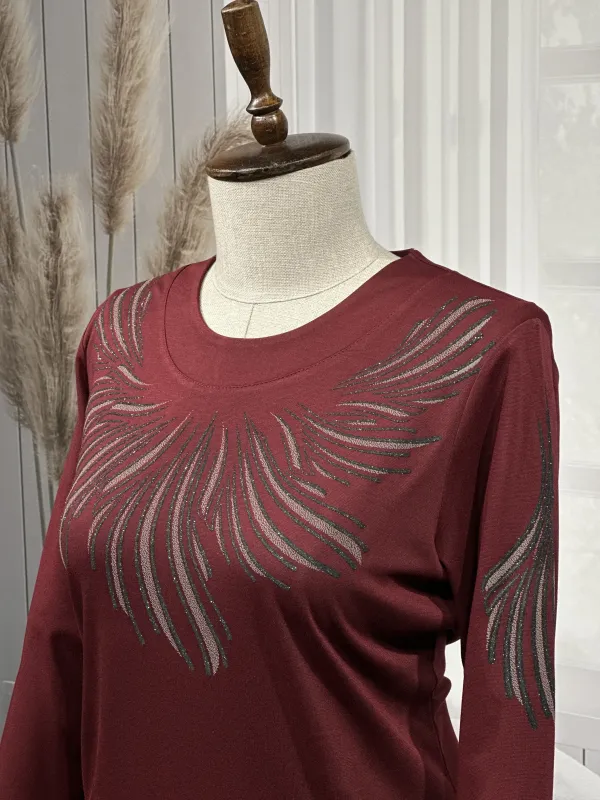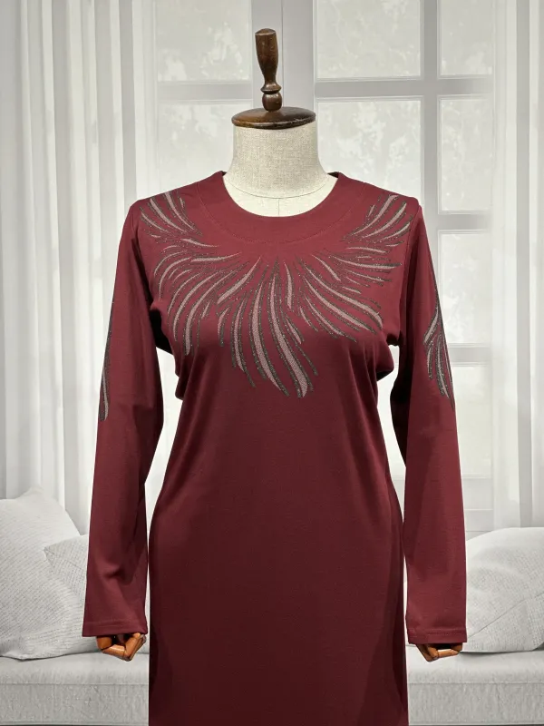 HESNA 8506 BASKILI ELBİSE - BORDO - (Asorti: 4-6)
