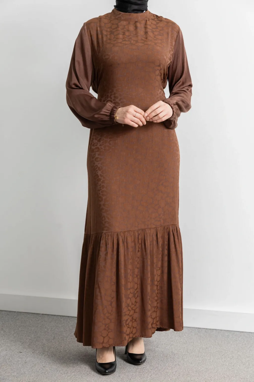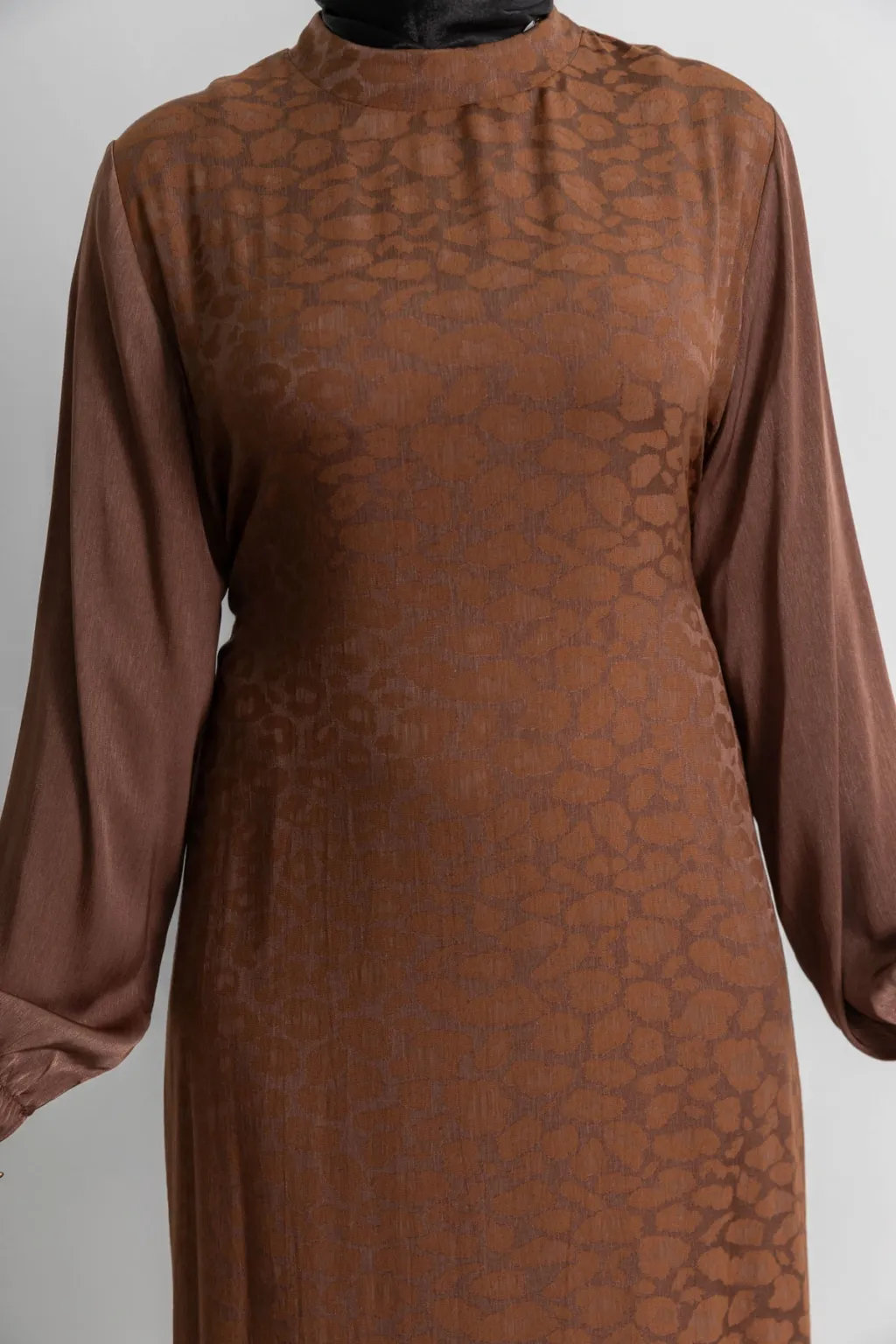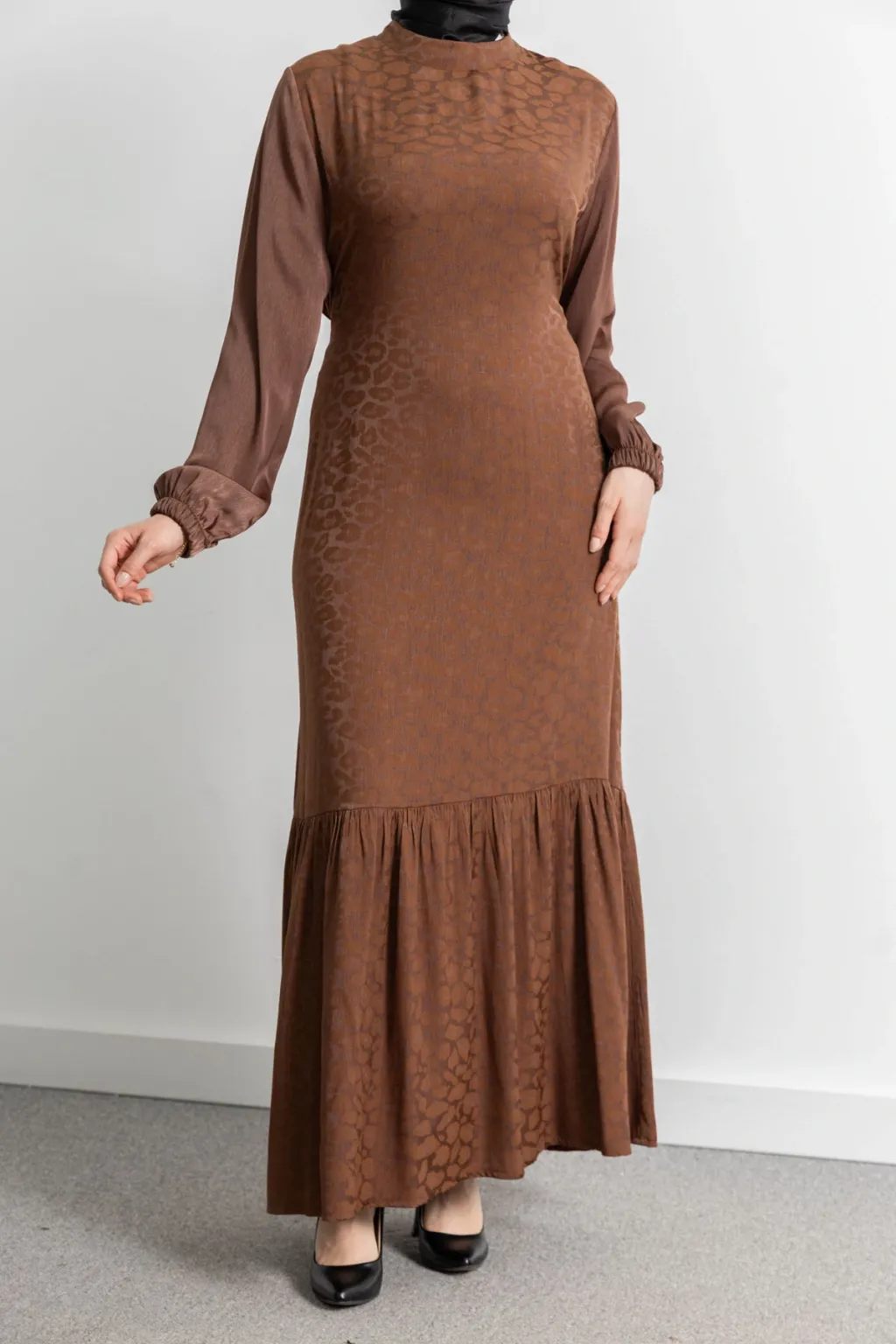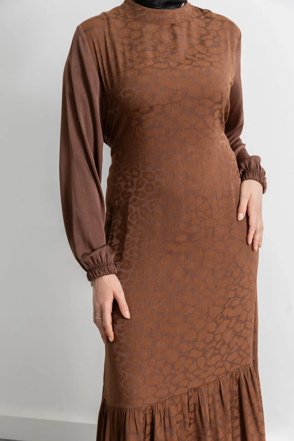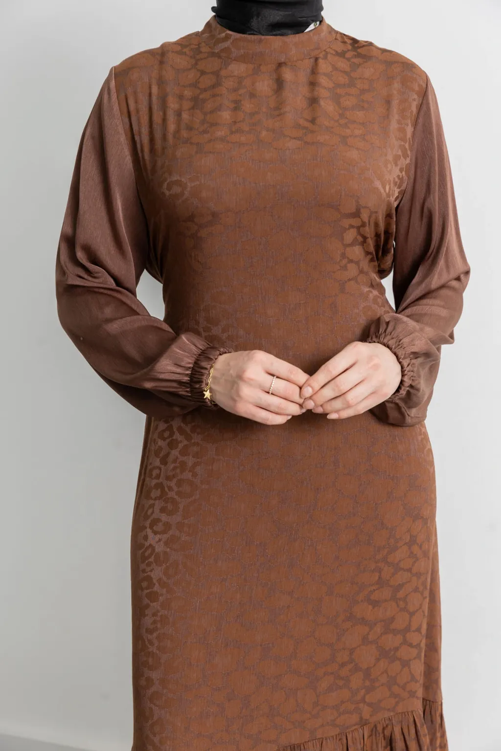 Etek Büzgü Detaylı Jakar Elbise - Taba - Leopar - (asorti: 46-52)