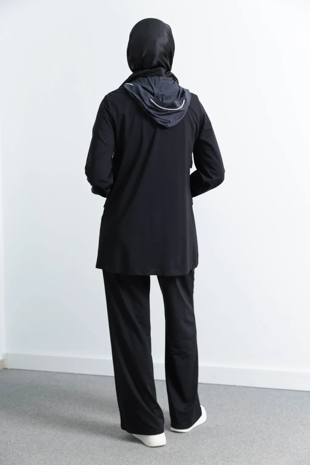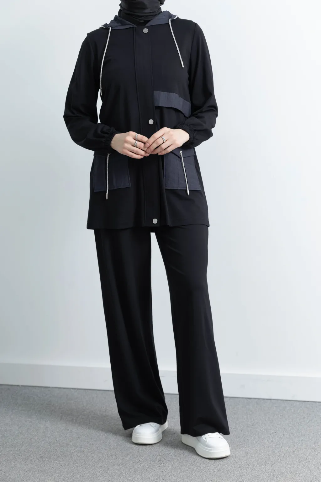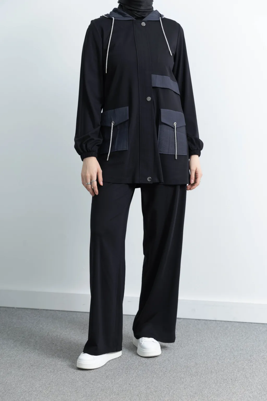 Letafet Kapüşonlu Düğme Detaylı Ceketli Pantolonlu Takım - SİYAH - (Asorti: M-XXL)