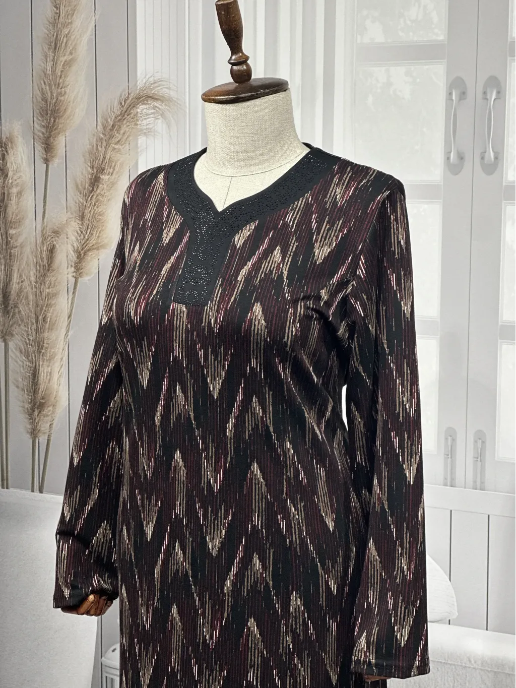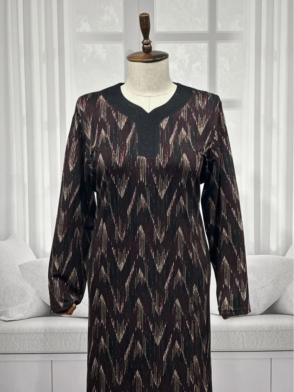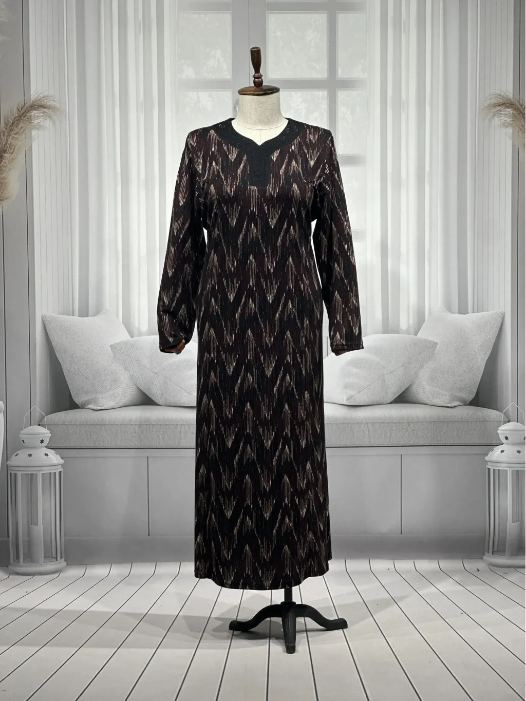 HESNA 8506 BASKILI ELBİSE - KAHVE - (Asorti: 4-6)