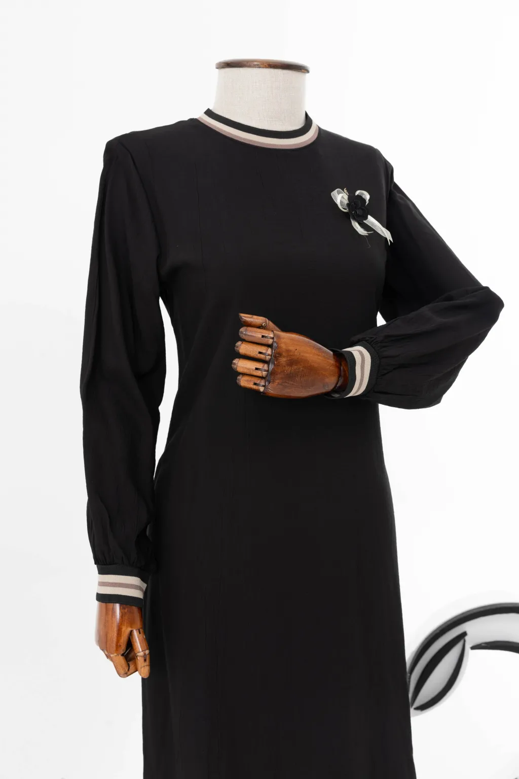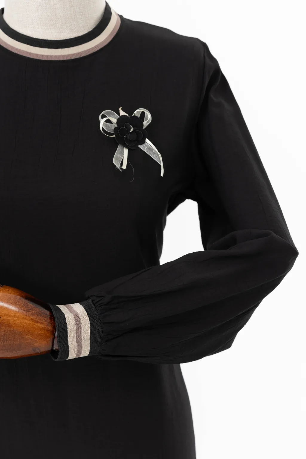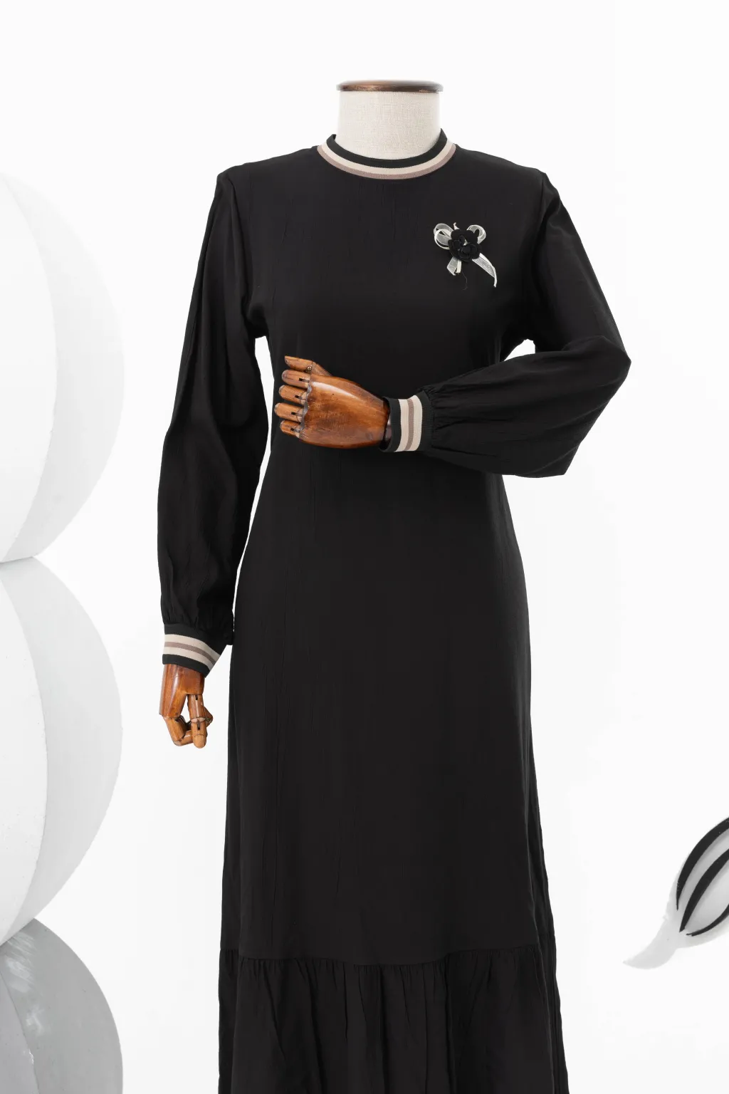 YAKASI VE MANŞETİ RİBANALI ELBİSE - SİYAH - (Asorti: M-XXL)