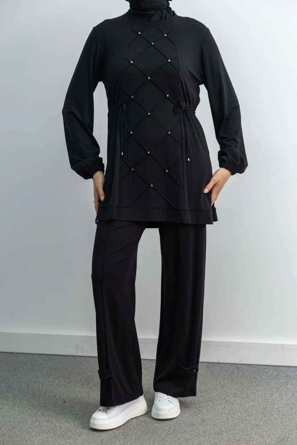 GARNİ KUMAŞLI ALLERLİ PANTOLON TAKIM - SİYAH - (Asorti: M-XXL)