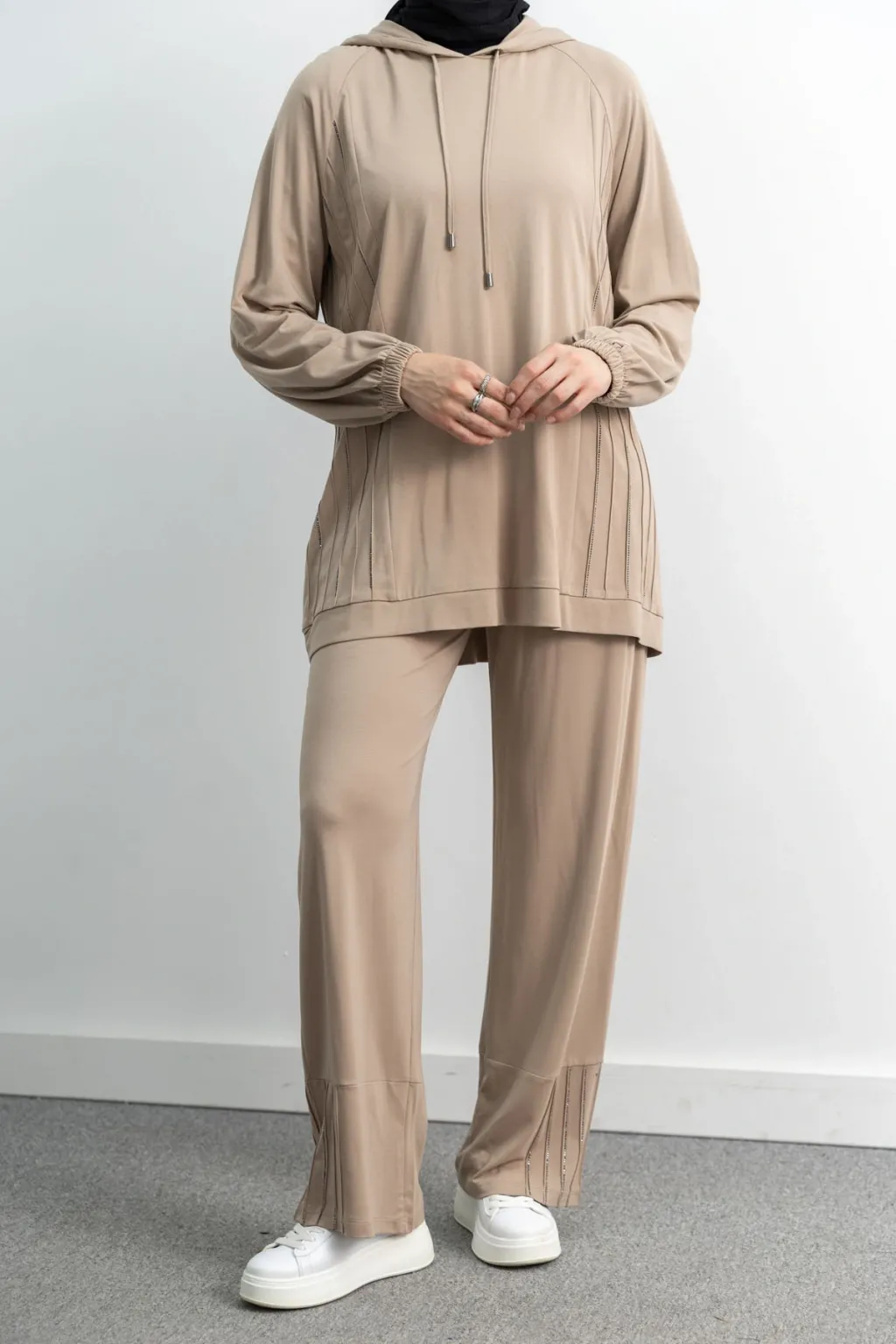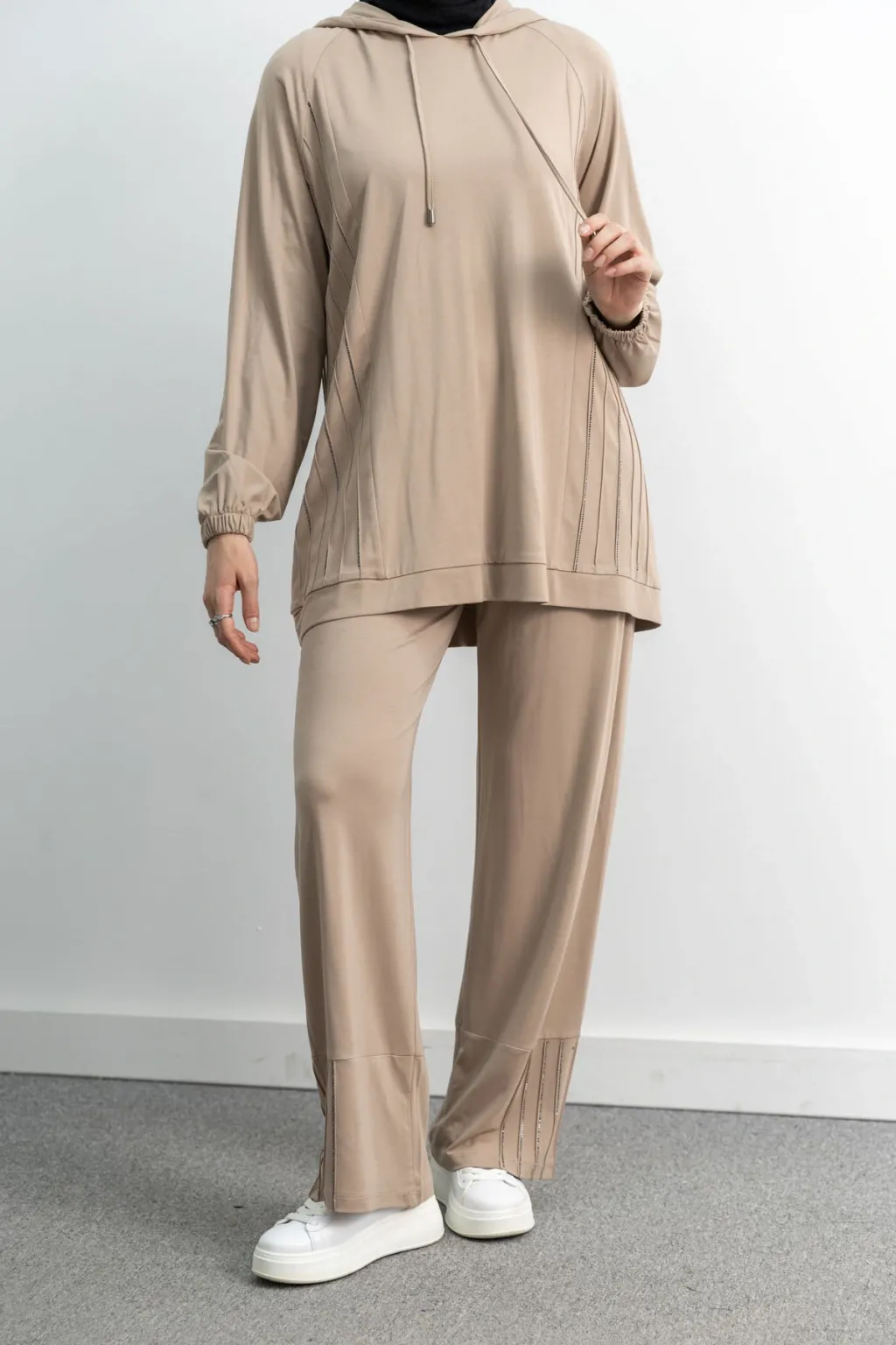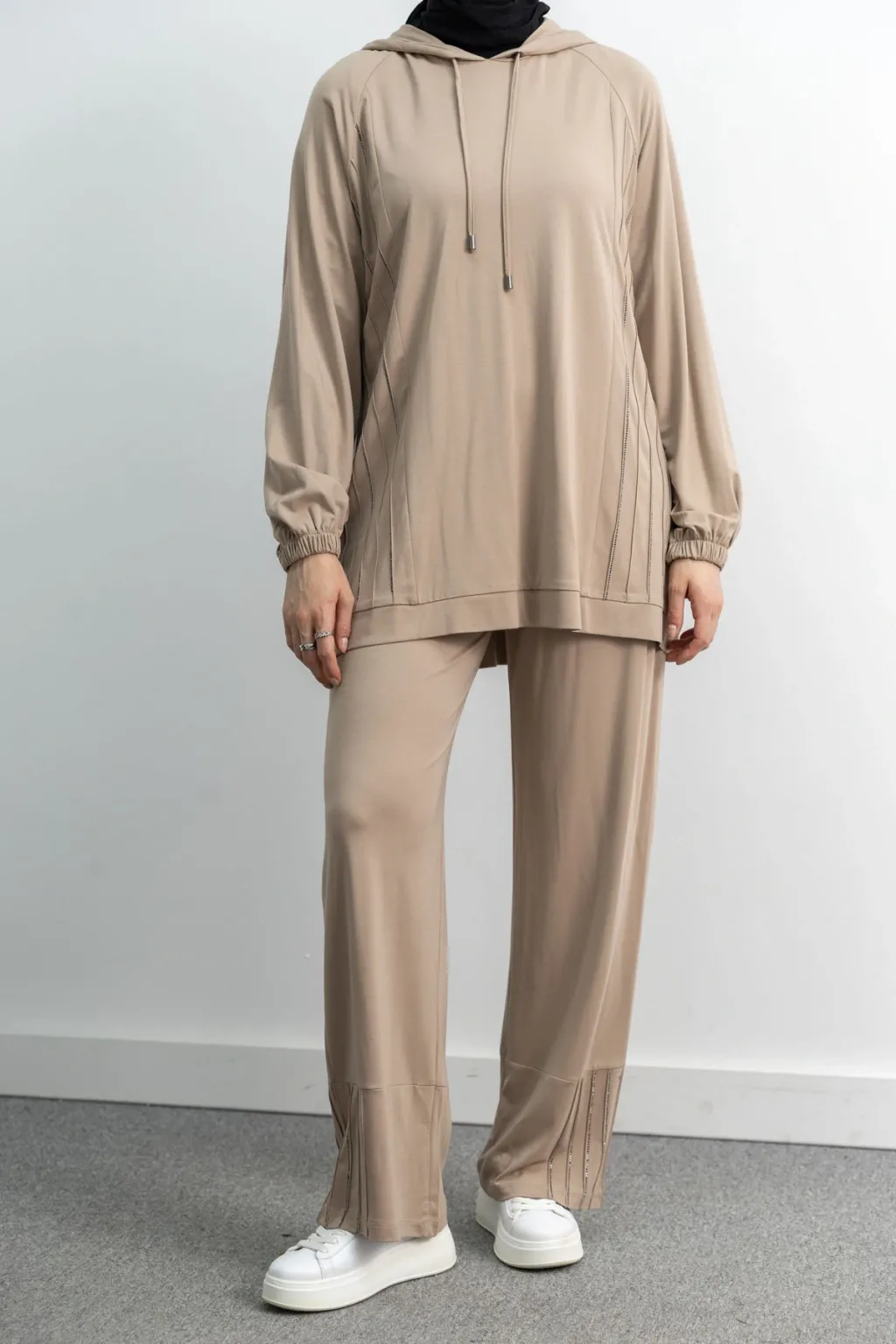 NAKIŞ VE İNCİ DETAYLI PANTOLONLU TAKIM - TAŞ - (Asorti: M-XXL)