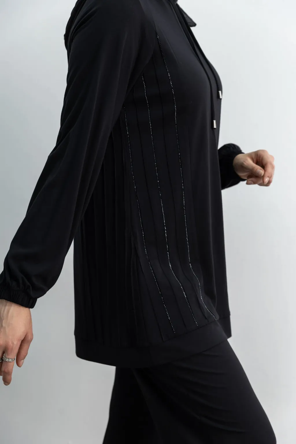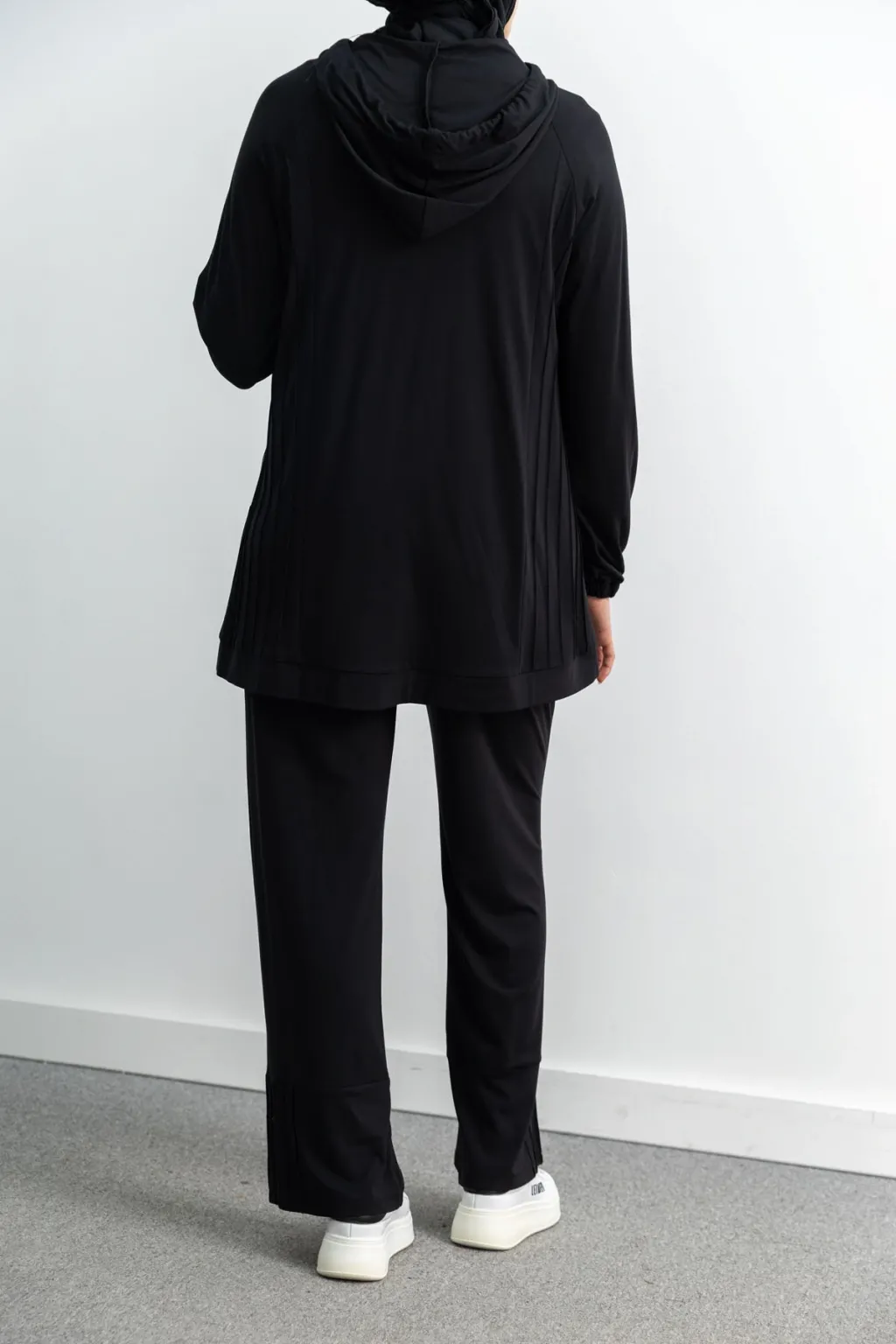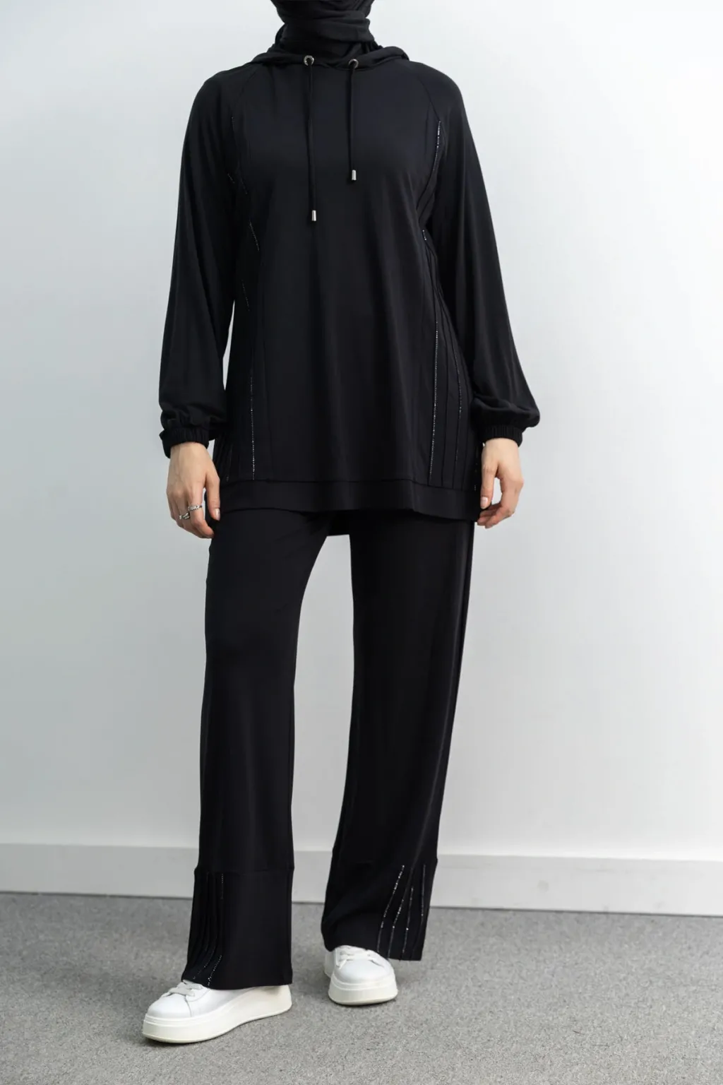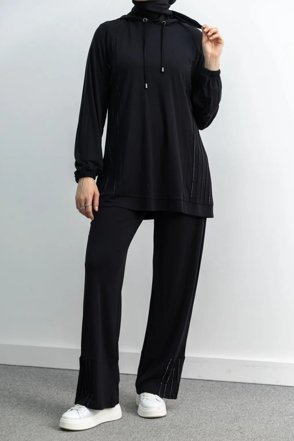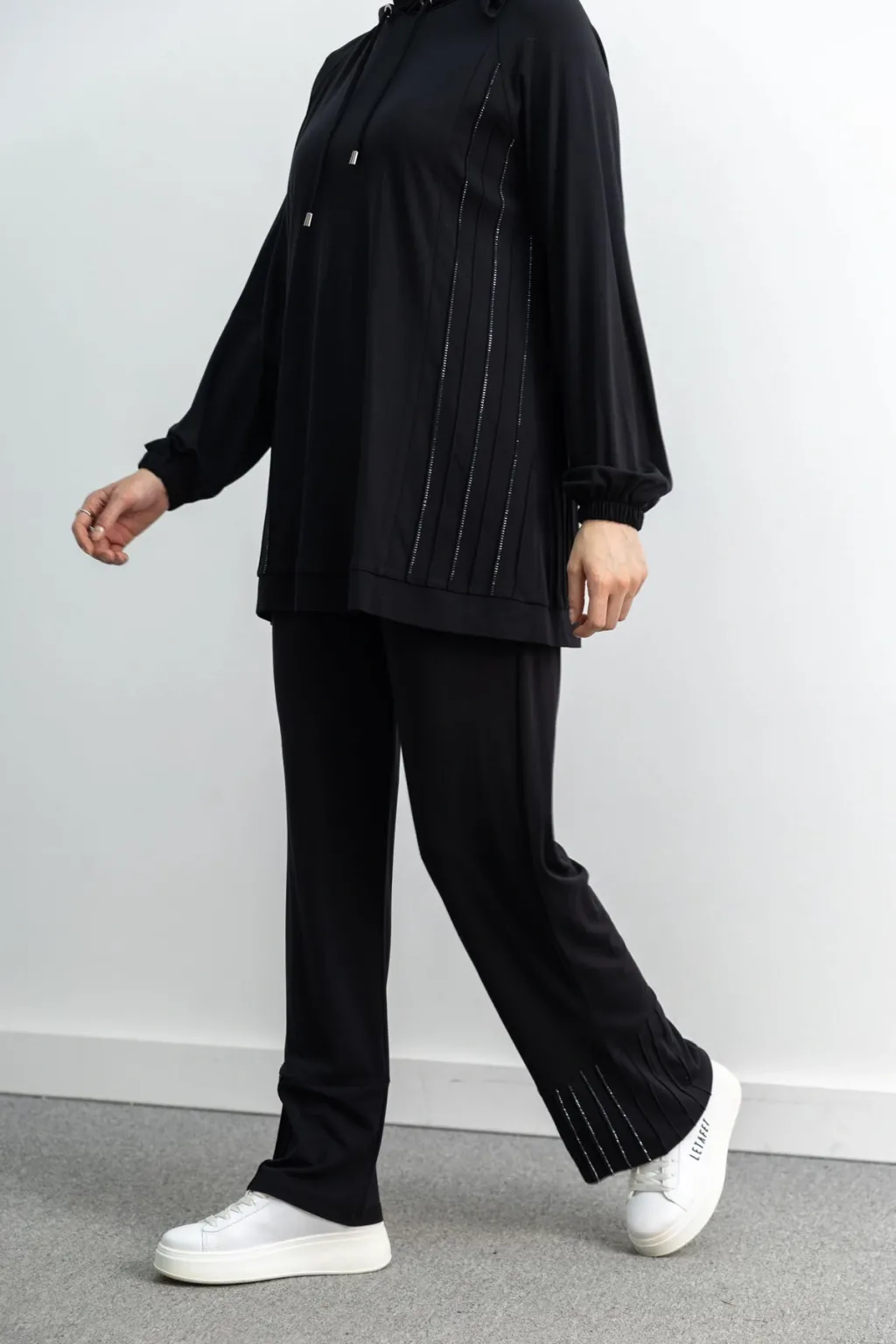 KOLU PİLİSE DETAYLI BROŞLU PANTOLONLU TAKIM - SİYAH - (Asorti: M-XXL)