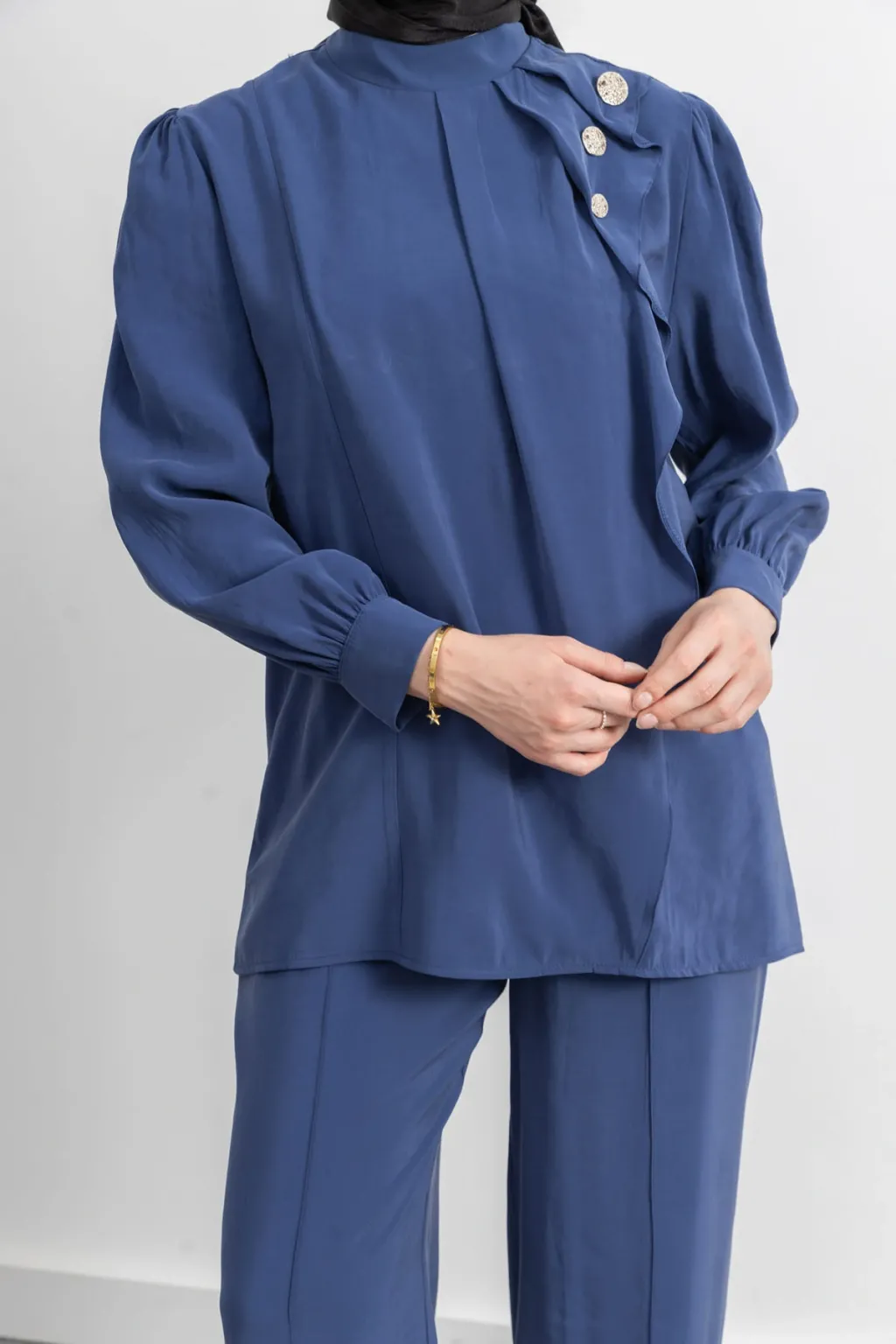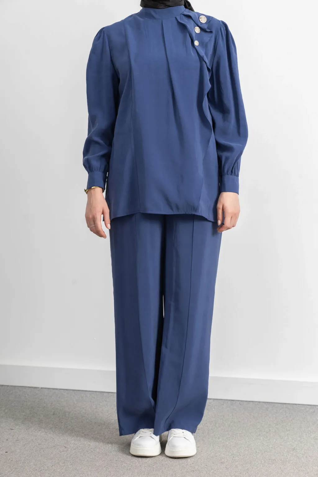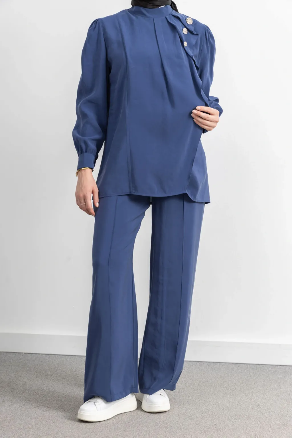 Letafet Önü Volan Detaylı Pantolonlu Takım - İndigo - (asorti: M-xxl)