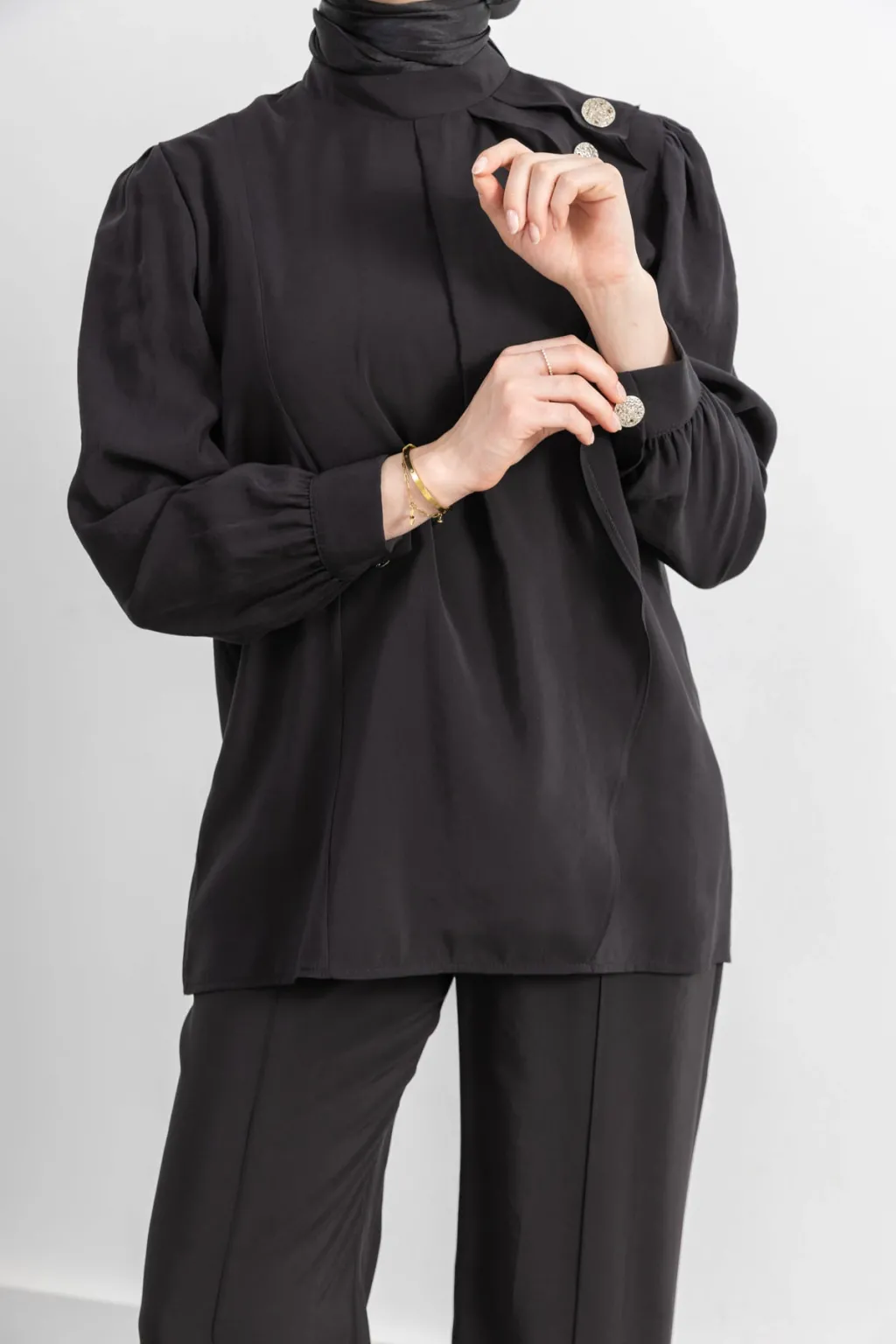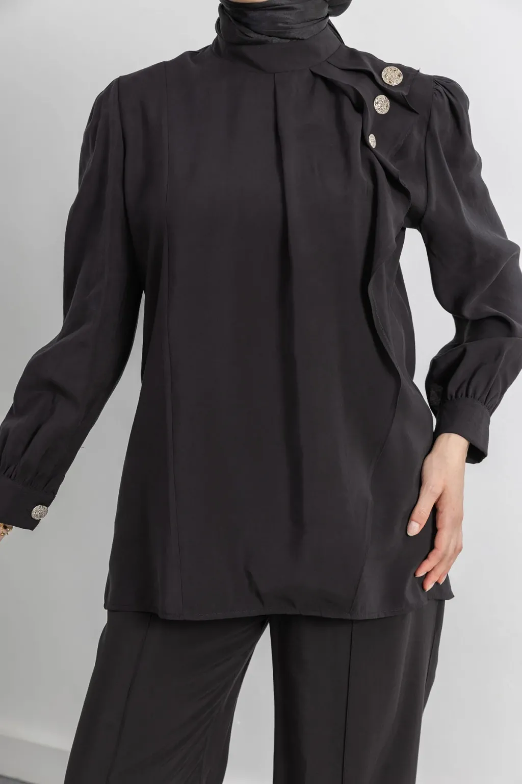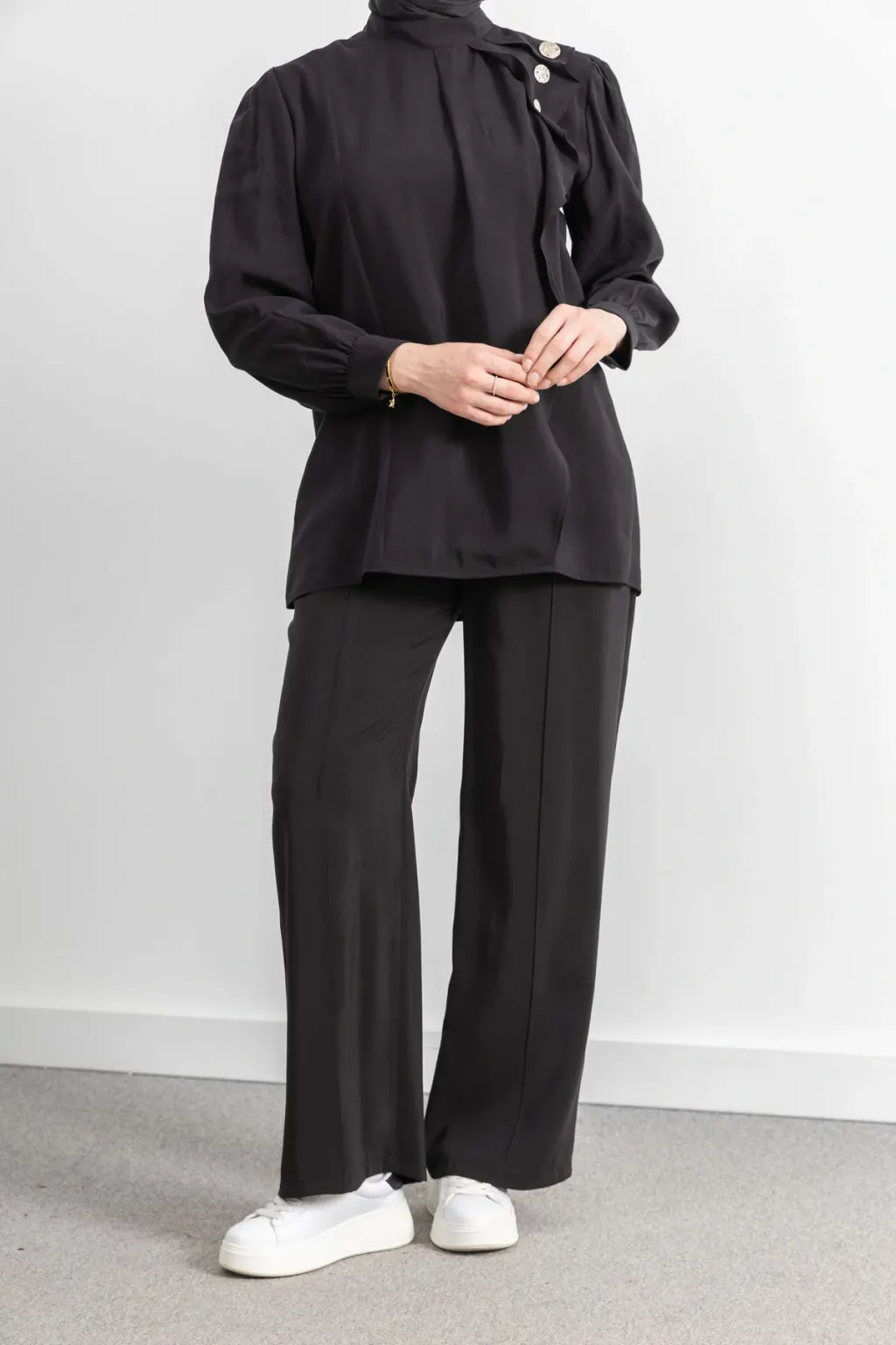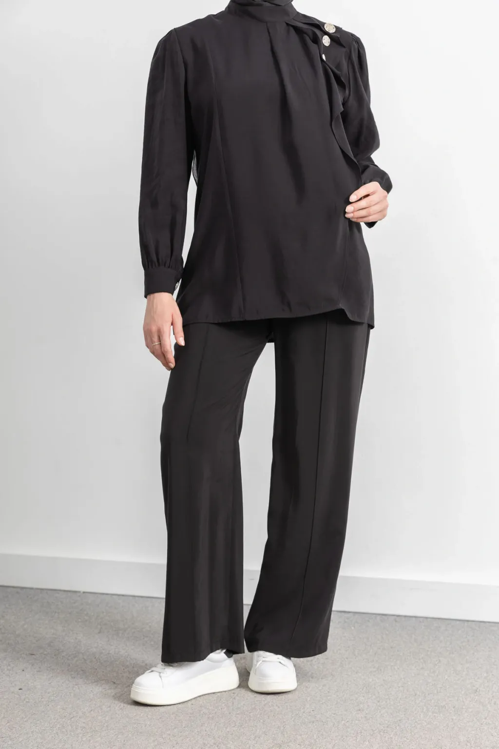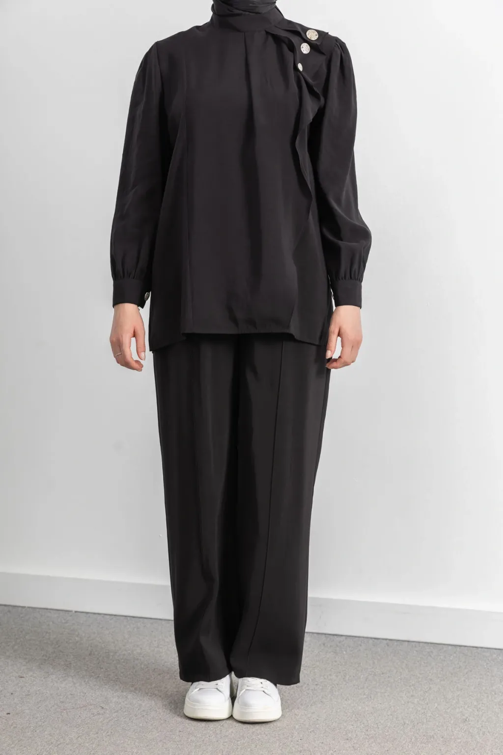 KOLU PİLİSE DETAYLI BROŞLU PANTOLONLU TAKIM - SİYAH - (Asorti: M-XXL)