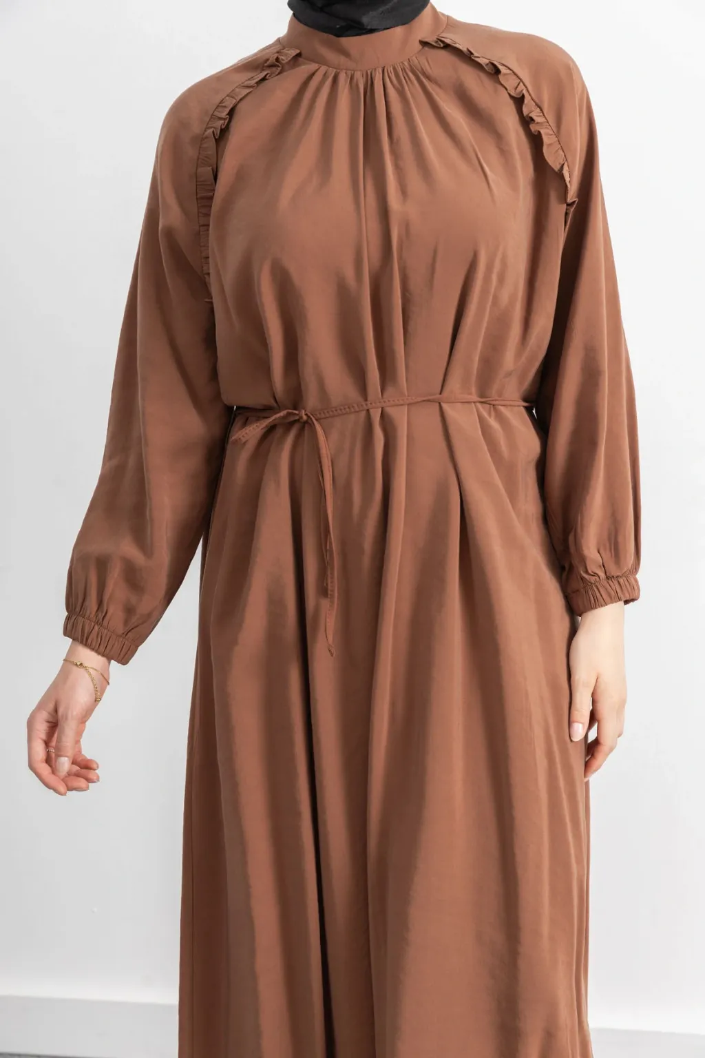 YAKASI VE MANŞETİ RİBANALI ELBİSE - KAHVE - (Asorti: M-XXL)