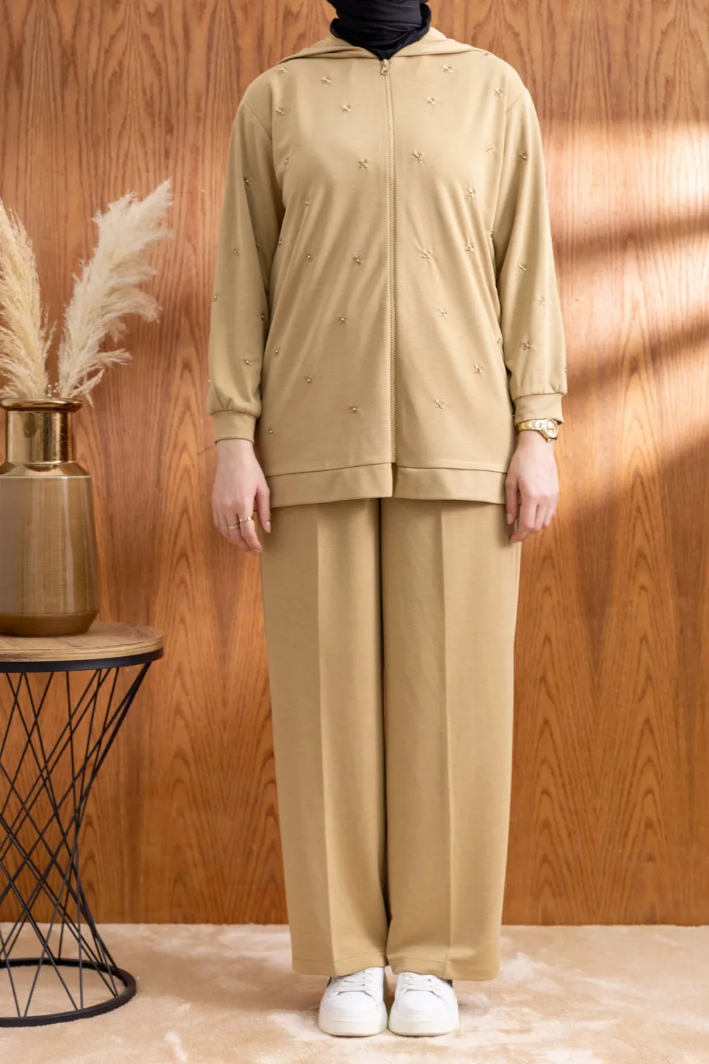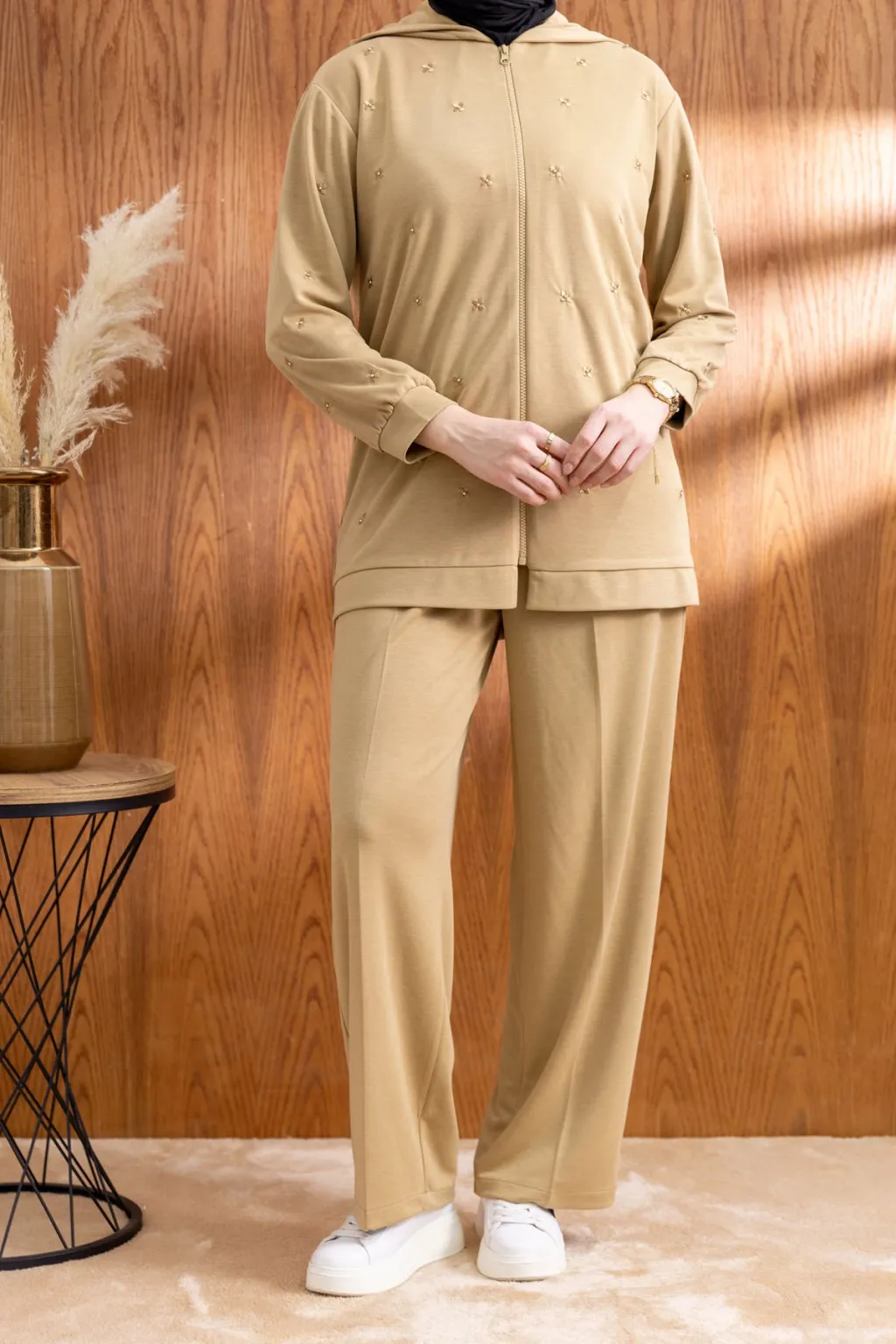 Nakış Ve İnci Detaylı Pantolonlu Takım - Taş - (asorti: M-xxl)