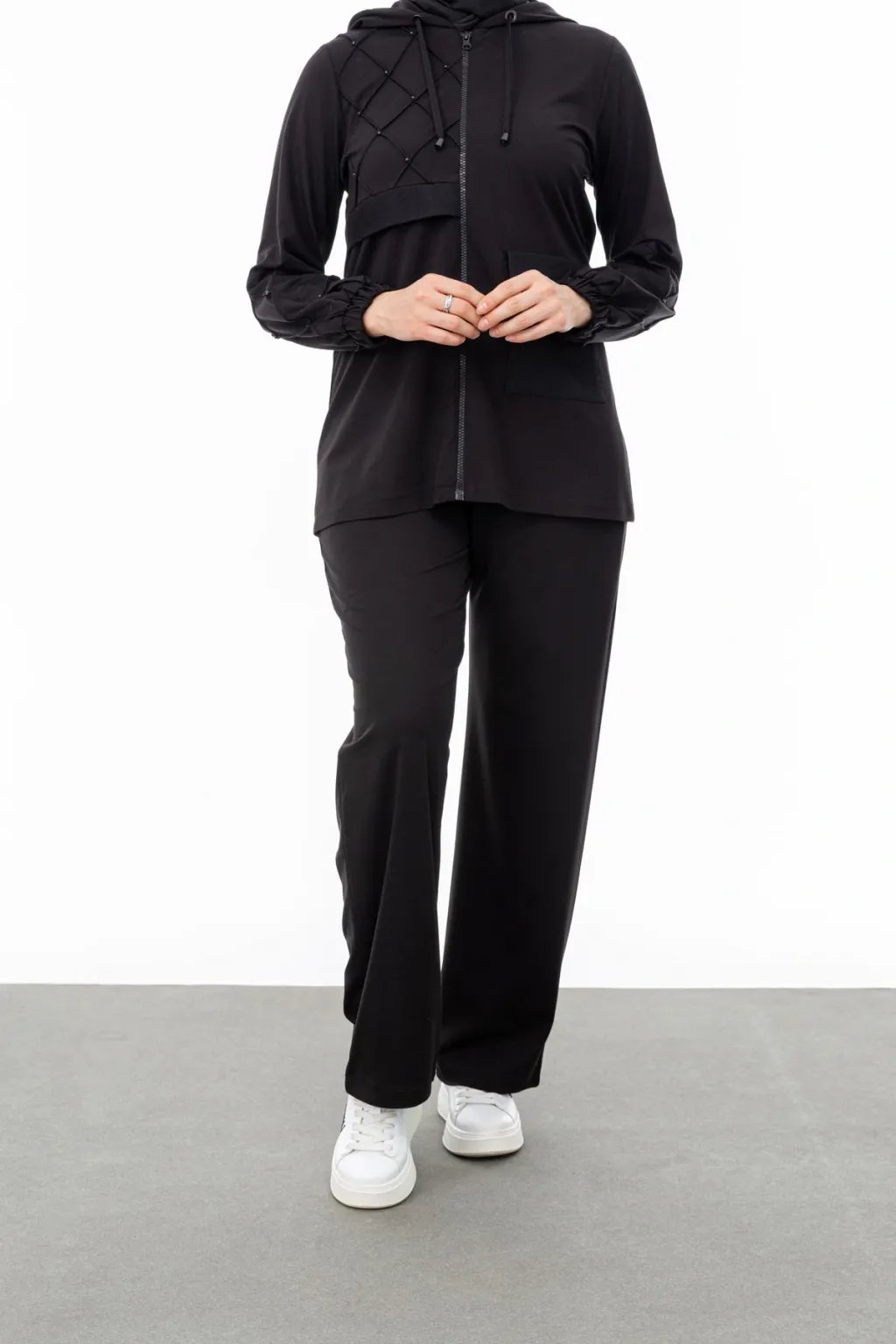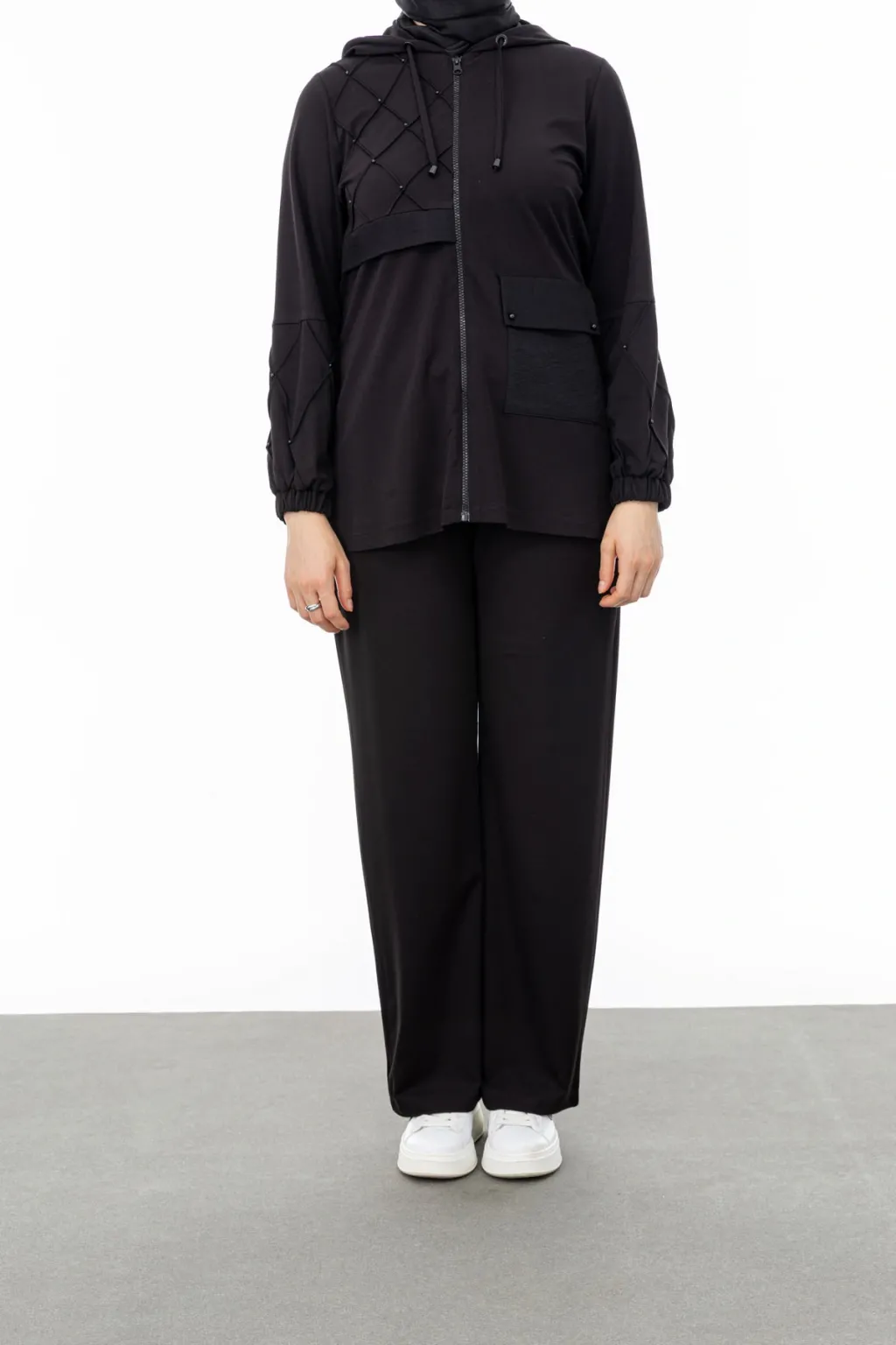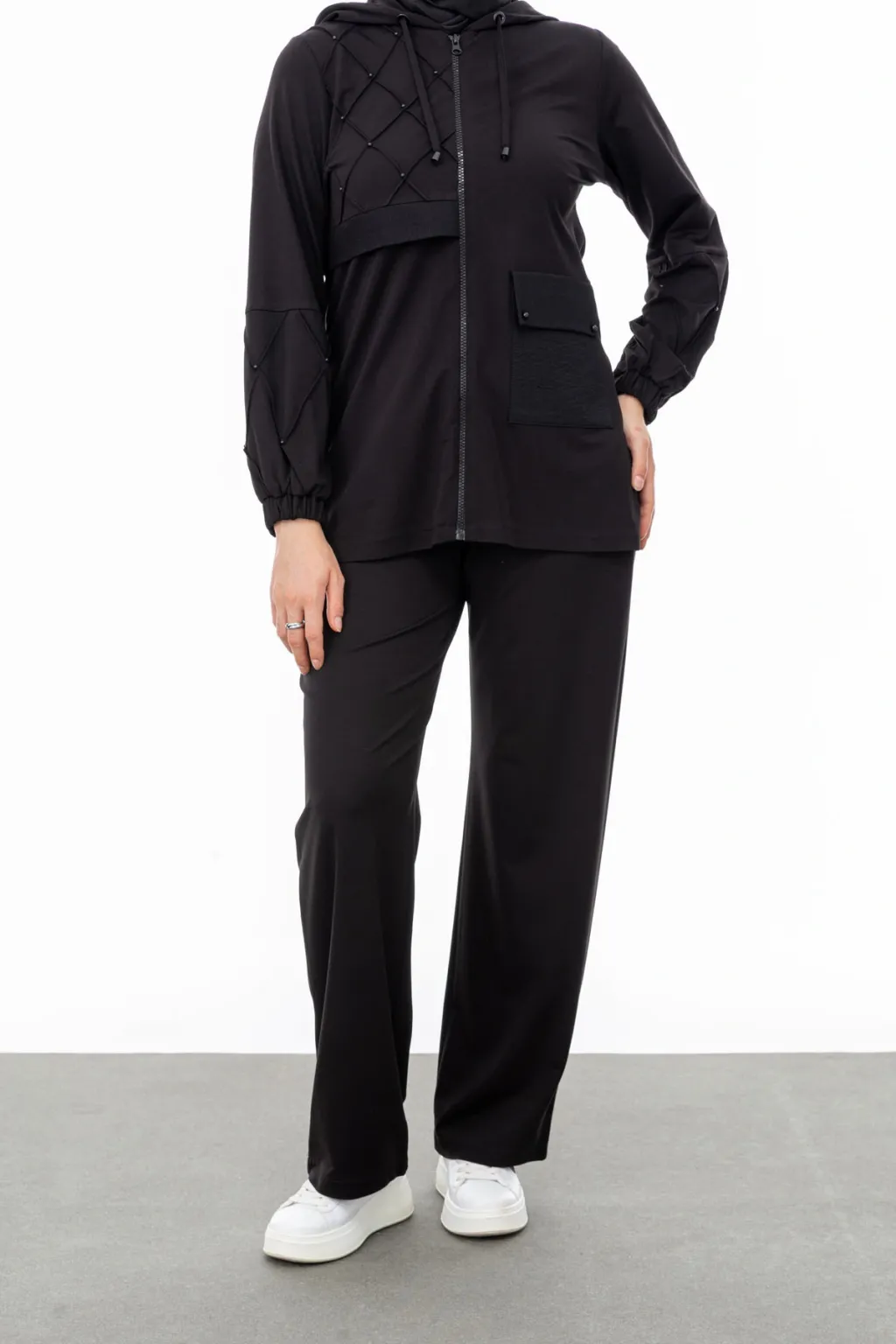 Nervür Detaylı İnci Pant. Takım - Siyah - (asorti: M-xxl)