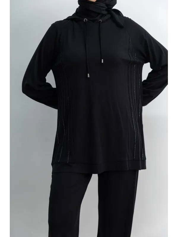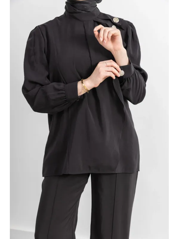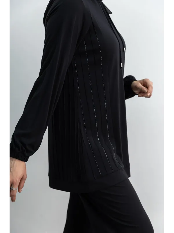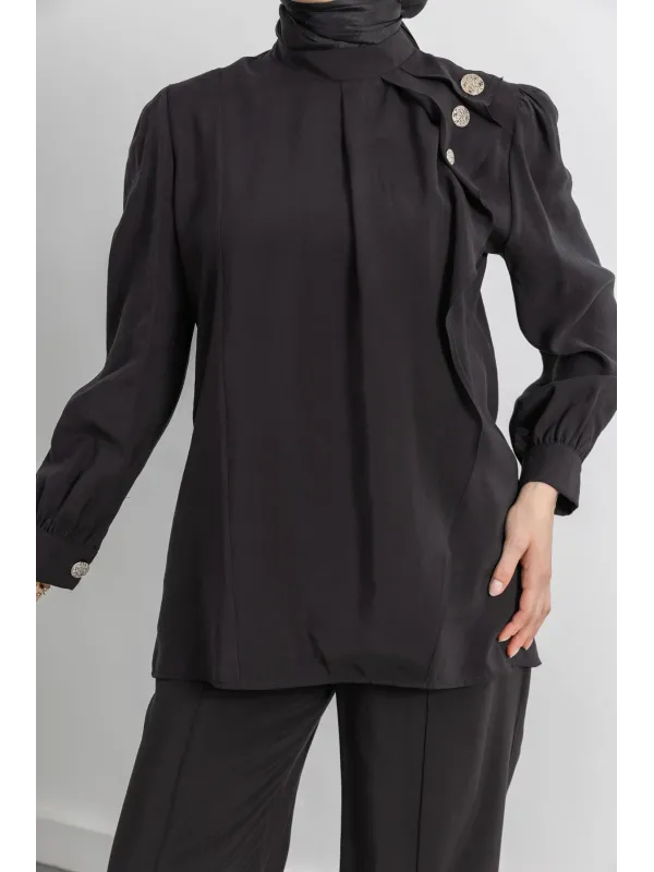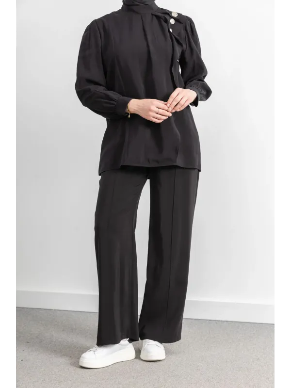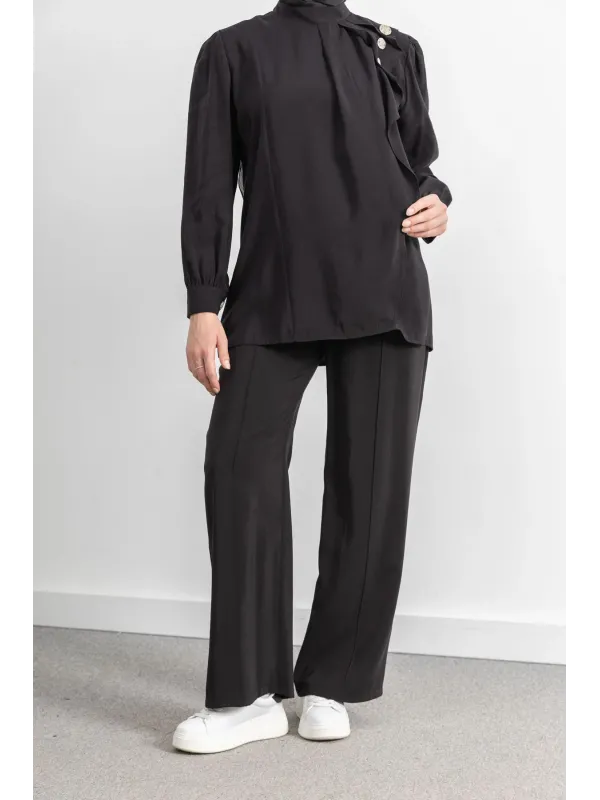 KOLU PİLİSE DETAYLI BROŞLU PANTOLONLU TAKIM - SİYAH - (Asorti: M-XXL)