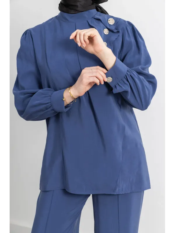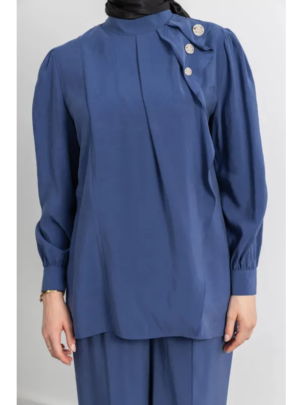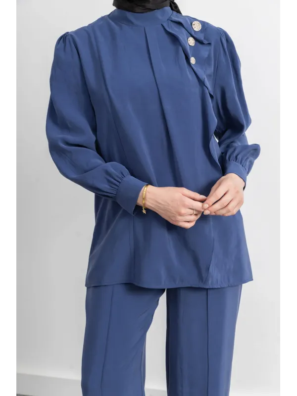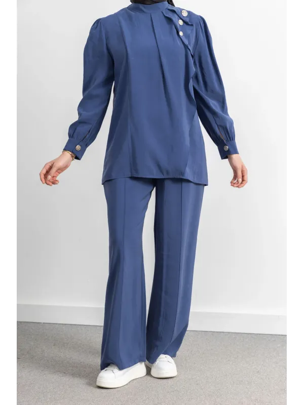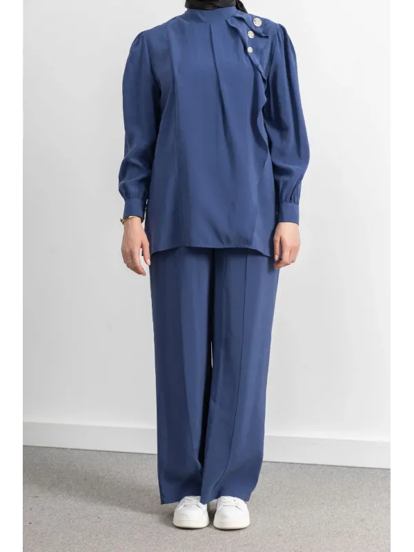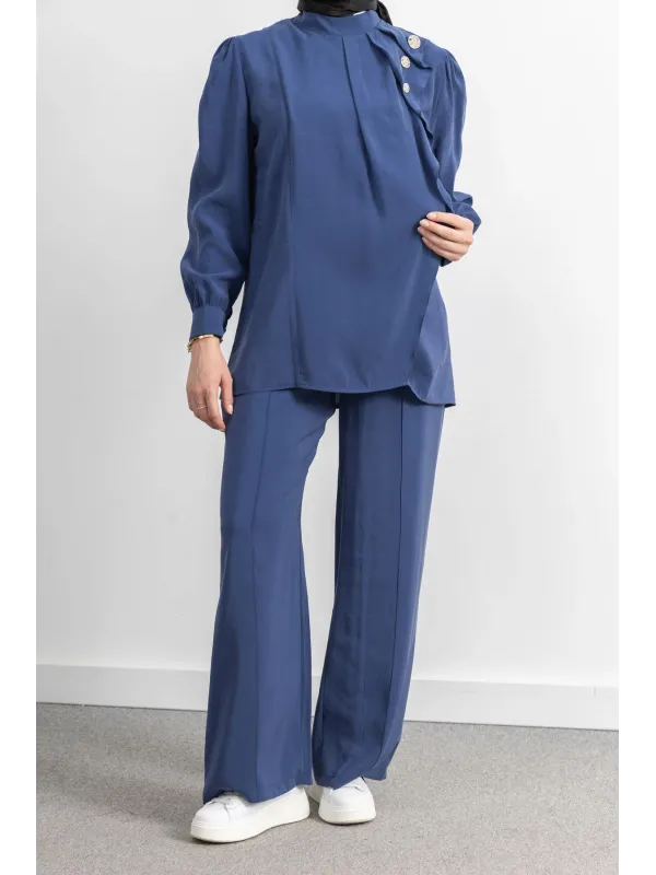 LETAFET ÖNÜ VOLAN DETAYLI PANTOLONLU TAKIM - İNDİGO - (Asorti: M-XXL)