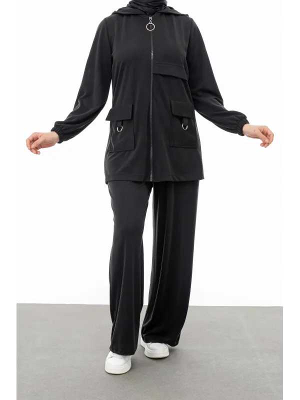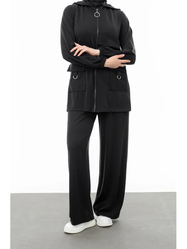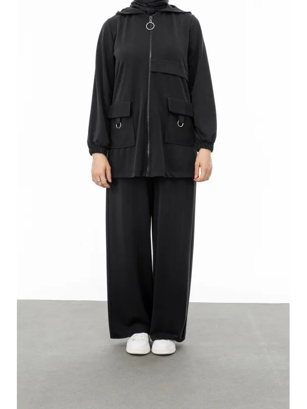 CEP KAPAKLI ÖNÜ FERMUARLI PANTOLONLU TAKIM - SİYAH - (Asorti: M-XXL)