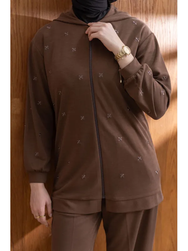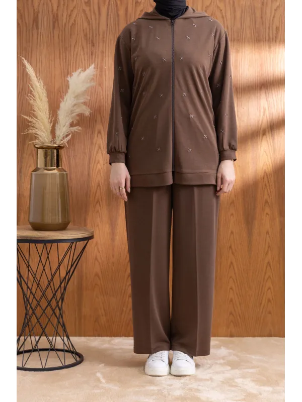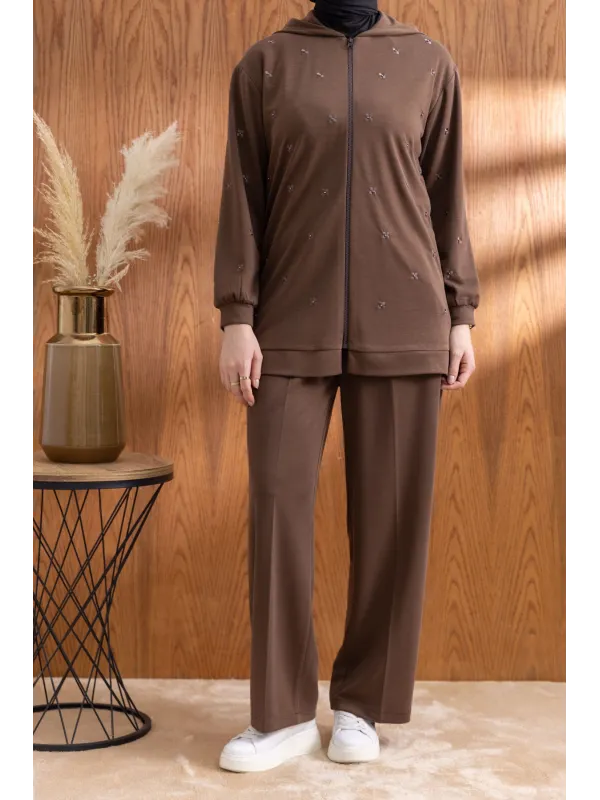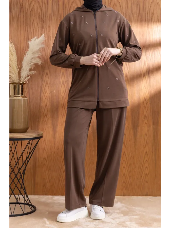 NAKIŞ VE İNCİ DETAYLI PANTOLONLU TAKIM - KAHVE - (Asorti: M-XXL)