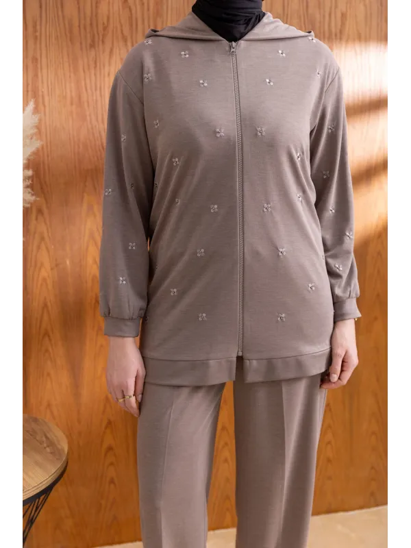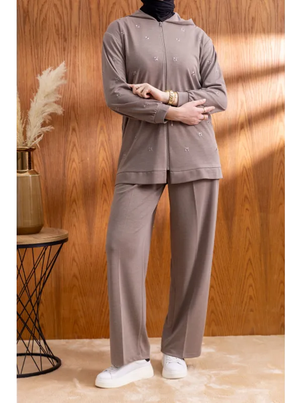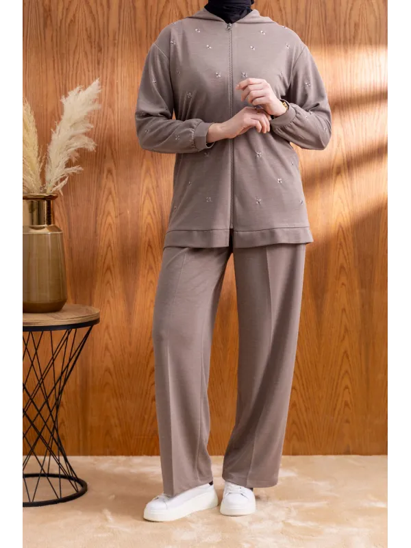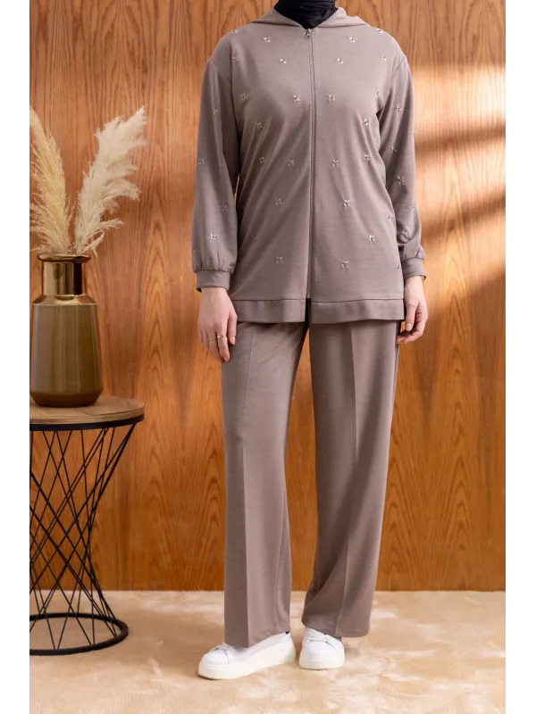 NAKIŞ VE İNCİ DETAYLI PANTOLONLU TAKIM - VİZON - (Asorti: M-XXL)