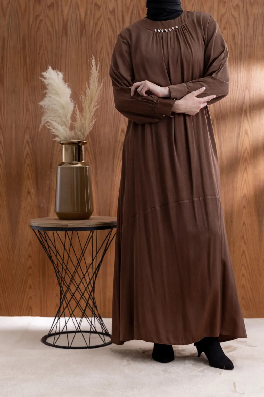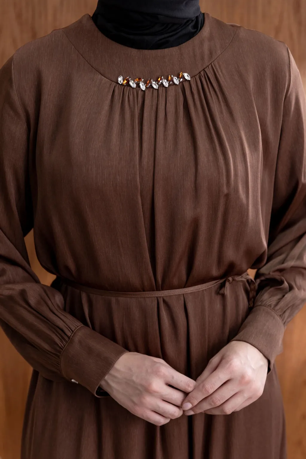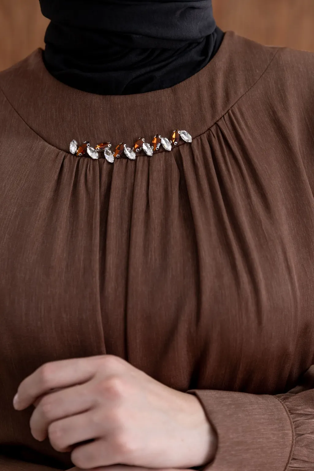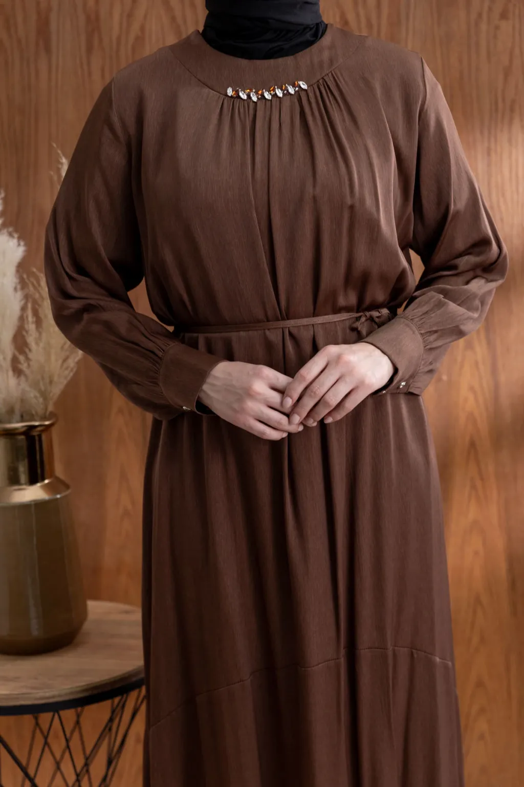 Yakası Büzgü Ve Taş Detaylı Elbise - Kahve - (asorti: 46-52)