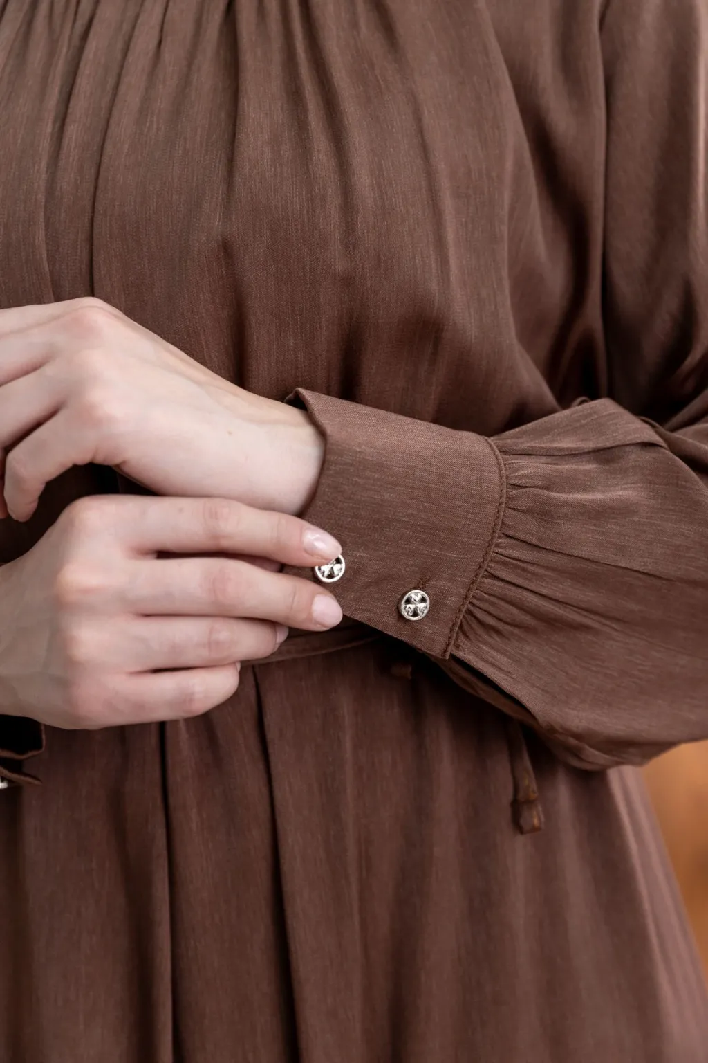 YAKASI VE MANŞETİ RİBANALI ELBİSE - KAHVE - (Asorti: M-XXL)