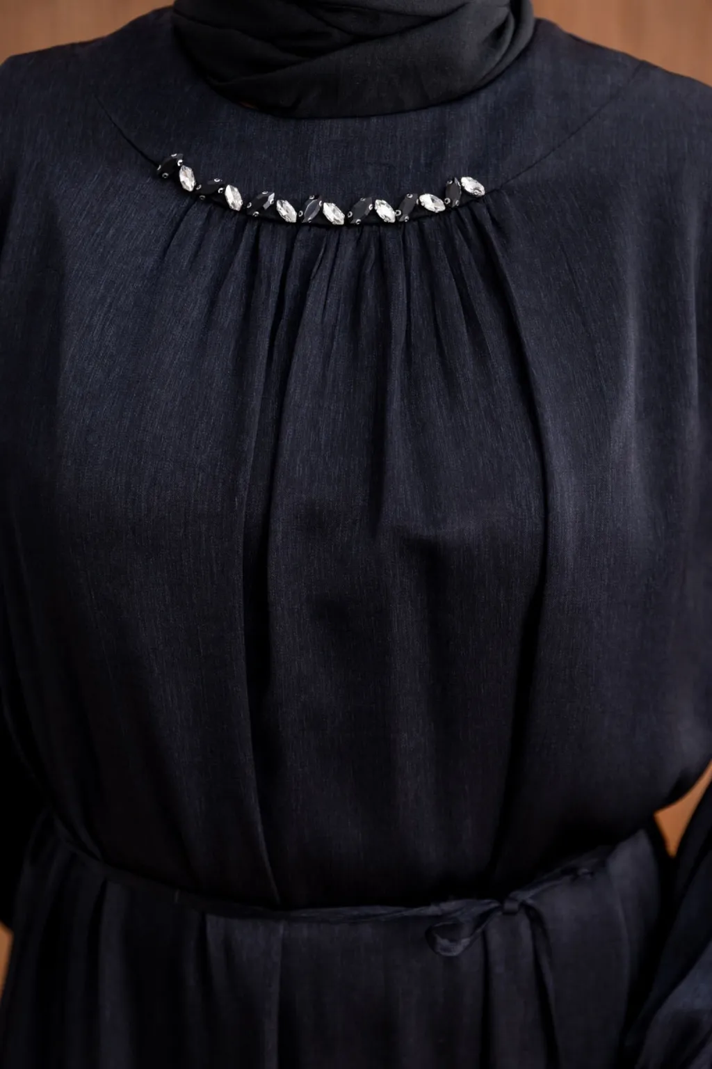 YAKASI BÜZGÜ VE TAŞ DETAYLI ELBİSE - LACİVERT - (Asorti: 46-52)