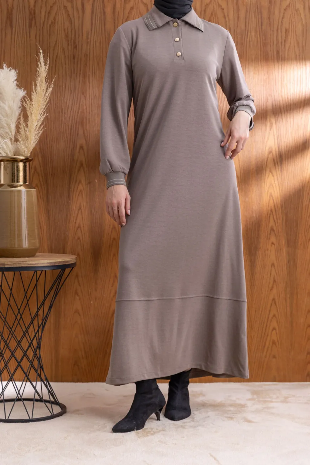 YAKASI BÜZGÜ VE TAŞ DETAYLI ELBİSE - KAHVE - (Asorti: 46-52)