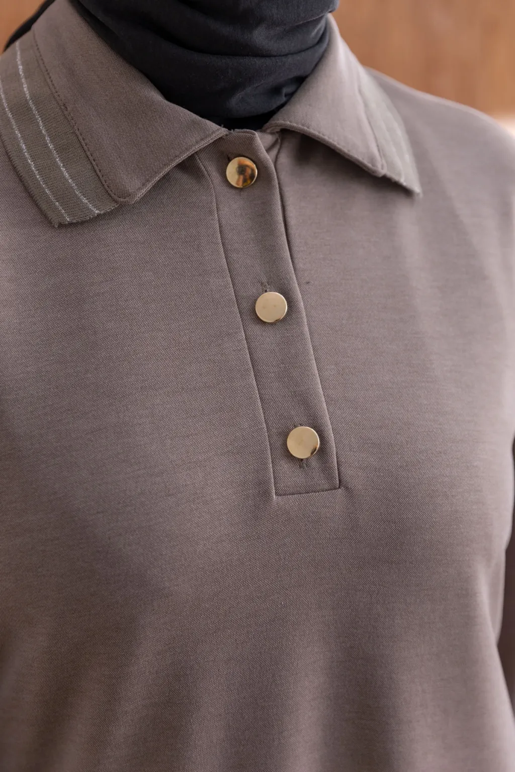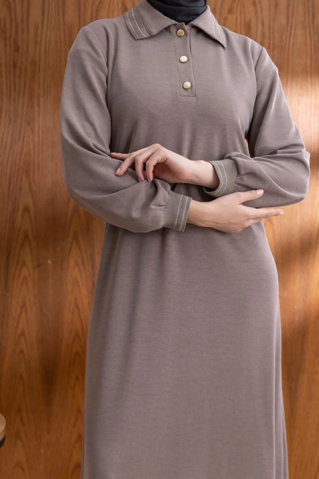 YAKASI VE MANŞETİ RİBANALI ELBİSE - KAHVE - (Asorti: M-XXL)
